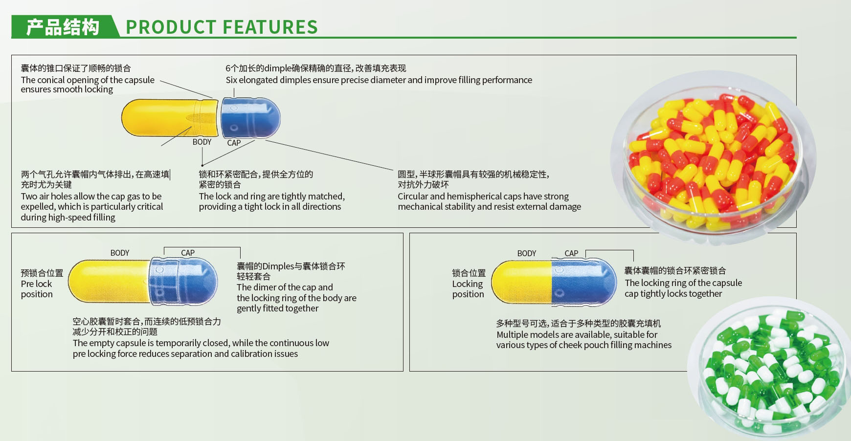 空心膠囊由藥用明膠加輔料精制而成的帽、體兩節(jié)膠囊殼組成。主要用于盛裝固體藥物。如自制散劑、保健品、藥劑等,為服用者解決了難入口、口感差的問題,實(shí)現(xiàn)了良藥不再苦口??招哪z囊越來越受歡迎,首先膠囊的形狀細(xì)長,易于吞服,是最受消費(fèi)者歡迎的劑型;此外,膠囊能夠很有效地掩蓋內(nèi)容物的令人不舒服的味道和氣味。膠囊的尺寸有多種多樣,包括00號(hào)加長和5號(hào)膠囊。膠囊上還可印上文字、商標(biāo)和圖案,呈現(xiàn)出獨(dú)特的定制外觀。